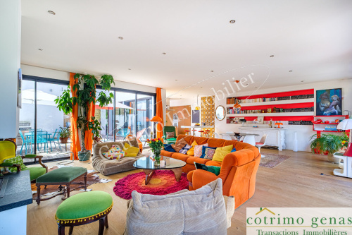 Exclusivité l'agence immobilière BMI COTRIMO vous propose à GENAS 69740 une villa moderne récente classification énergétique DPE en A avec piscine offrant un agréable confort de vie d'une surface de 200m² habitables avec 5 grandes chambres dont 1 suite parentale de 29m² le tout avec garage attenant sur une parcelle de terrain de 815m² environ clos et arboré proche toutes commodités.Vous recherchez une maison facile à vivre, au calme, où vous aurez à souhait la possibilité de profiter des extérieurs avec du soleil ou de l'ombre en toutes saisons ? Coup de coeur assuré, cette maison moderne et prête à vivre est faite pour vous !Maison lumineuse avec un très bel espace de vie salon/séjour/cuisine de 65m² ouvrant sur une terrasse de 40m² exposée Sud/ouest. Au rdc, hall d'entrée, le grand salon/séjour /cuisine US toute équipée larges baies coulissantes ouvrant les extérieurs, 1 suite parentale avec dressing, Sd'eau, wc, une salle de jeux de 37m².. 1 salle de jeux /lecture avec espace télévision de 20m², wc.A l'étage, 4 grandes chambres (12,81m² 13m² 13,45m² et 15m² ) avec placards, 1 salle de bains, seconde Sd'eau, wc. 2 des chambres côté Ouest ouvrant sur une terrasse de 40m² en plus !Grand garage attenant (isolé et carrelé avec cuisine d'été) de 34.50m².Concernant le chauffage : au rez-de-chaussée, au sol basse température via pompe à chaleur air/eau complété par des climatisations réversibles pour le Rdc et l'étage.À l'extérieur vous découvrirez un véritable havre de paix intimiste avec une terrasse de 40m², une piscine 8 X 4m avec filtration sel (avec contrôle Ph) ainsi qu'un jardin clos et arboré où vous pourrez vous détendre et profiter de belles journées ensoleillées avec vos proches. Concernant le DPE : maison très récente avec étude thermique réalisée.Consommation conventionnelle : 69 kWh ep/m².an (Classe A)Estimation des émissions : 2 kg eqCO2/m².an (Classe A)Estimation des coûts annuels : entre 1 090 € et 1 540 € par an, prix moyens des énergies indexés sur les années 2021, 2022, 2023selon méthode 3CL-DPE 2021.Taxe foncière : 1100€Honoraires d'agence à charge vendeurs.Contactez nous pour une visite !Les informations sur les risques auxquels ce bien est exposé sont disponibles sur le site Géorisques : www.georisques.gouv.fr